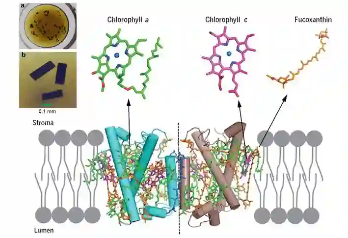 三角褐指藻类囊体膜上的FCP二聚体晶体结构。a和b:FCP蛋白晶体;蛋白中的叶绿素a(绿色),叶绿素c(洋红色)和岩藻黄素分子结构分别以棍状图显示,蓝色为硅甲藻黄素。