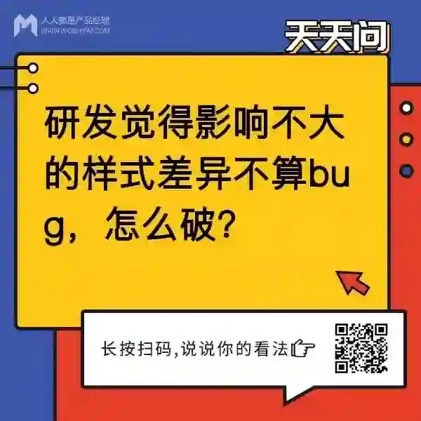 作为一名产品经理,你一定遇到过与开发意见不和的情况,例如:这个需求究竟合不合理,能不能赶一赶排期等等。天天问小伙伴则遇到了“研发觉得影响不大的样式差异不算 Bug ”的这个问题,一起来看看大家提供了什么好的解决方法吧~