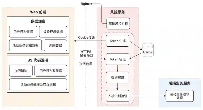 Web 前端:用户通过 Web 页面来参与活动,同时 Web 前端也会收集用于人机识别验证的用户交互行为数据。由于不同终端(移动端 H5 页面和 PC 端页面)交互形式不同,收集用户交互行为数据的侧重点也会有所不同。
