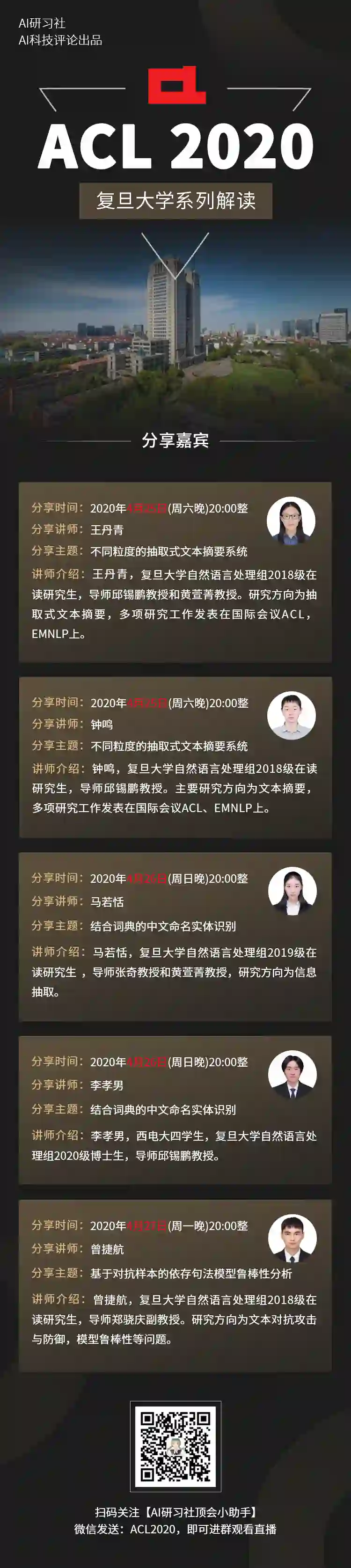 为促进学术交流,让更多师生及时了解最新前沿研究,AI科技评论联合复旦大学,重磅推出「ACL 2020 -复旦大学系列论文解读」。我们将在4月25-27日,连续三天进行 3 场直播,其中包含 5 篇 ACL 论文以及复旦大学在相关方面的研究进展。