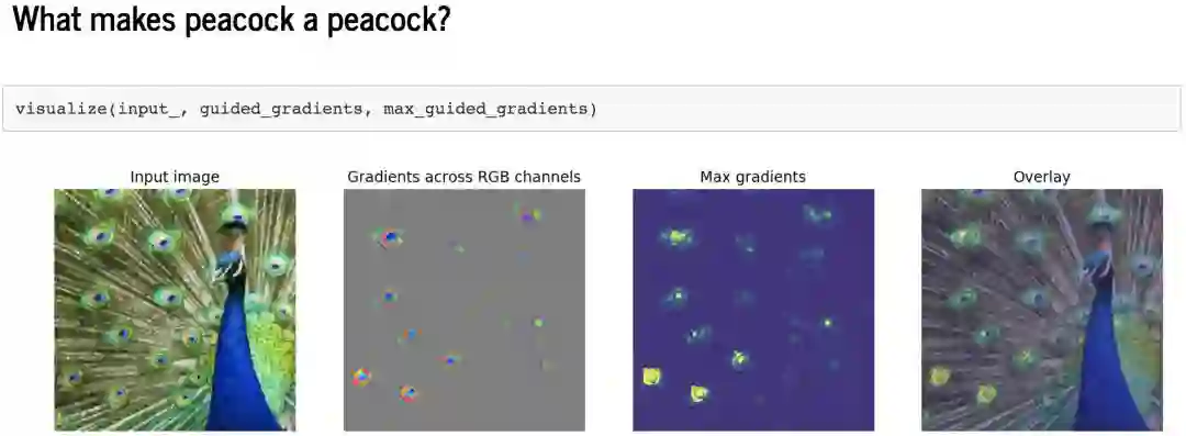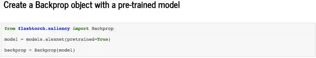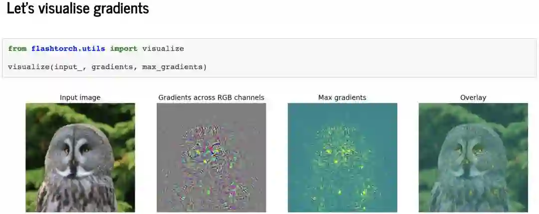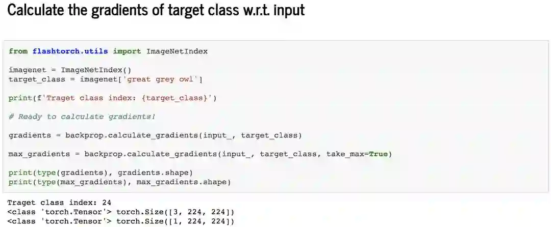 在实例化时,它接收模型Backprop(model)并将自定义钩子注册到网络中感兴趣的层,以便我们可以从计算图中获取中间梯度以进行可视化。由于PyTorch的设计方式,这些中间梯度并不是立即可用的。FlashTorch会帮你整理。