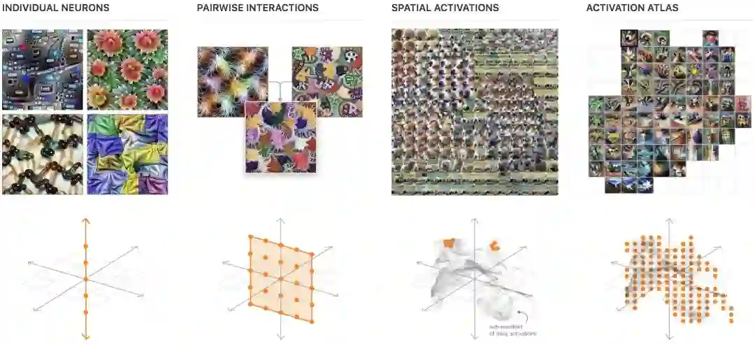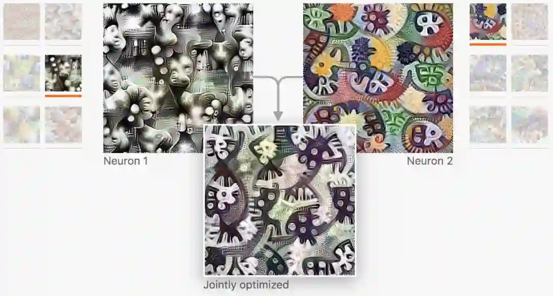 这是一个巨大的进步,但是有一些缺点,因为它没有提供观察整个网络如何运作的能力,因为神经元不是孤立运作。这导致了对神经元之间相互作用的可视化研究。Olah等人通过在两个神经元之间进行添加或插值来演示激活空间的算术性质。