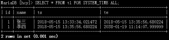 SELECT id,name FROM t1 FOR SYSTEM_TIME ALL where id = 1 AND name =