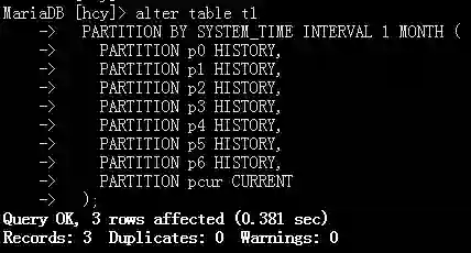 意思是:按照月份分割历史数据,今天至一个月后(2018年6月15日)的历史数据放入p0分区,次月的历史数据放入p1分区,依次类推至(2018年12月15日)存p6分区。当前数据存储在pcur分区里。