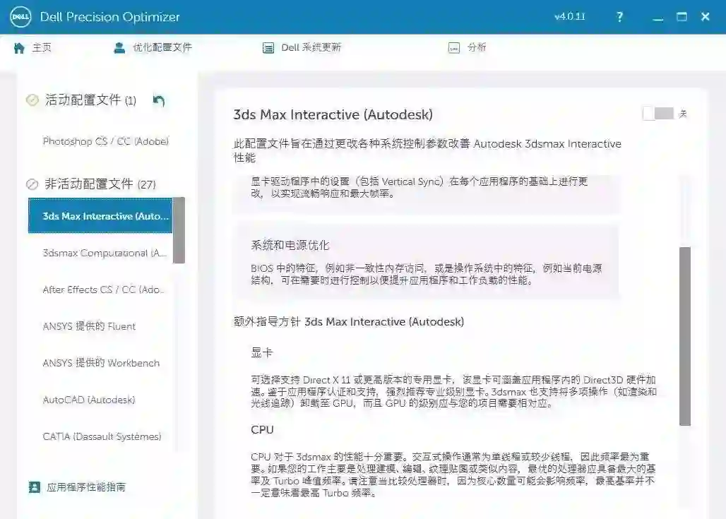 其次戴尔Precision 5530对软硬件的适应能力以及自我调整能力都非常强,precision5530笔记本自带Dell Precision Optimizer软件,它是一个自带开启的功能,我买了Precision产品之后可以做一些设定,在使用PS、Adobe软件或者ISV认证软件的时候,就会自动优化应用程序的效能。戴尔的这款软件和32家顶级ISV软件合作商合作,通过了超过20000+软硬件组合的测试,在运行软件时,都能使得该软件在使用过程中更稳定、打开速度更快。