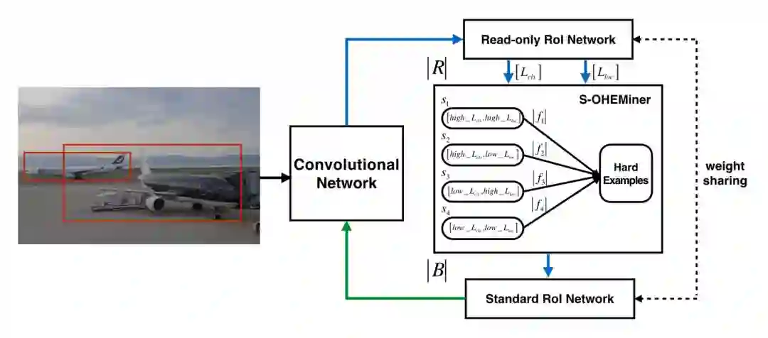 在实际操作中是将原来的一个 ROI Network 扩充为两个 ROI Network,这两个 ROI Network 共享参数。其中前面一个 ROI Network 只有前向操作,主要用于计算损失;后面一个 ROI Network 包括前向和后向操作,以 hard example 作为输入,计算损失并回传梯度。该算法在目标检测框架中被大量使用,如 Fast RCNN。