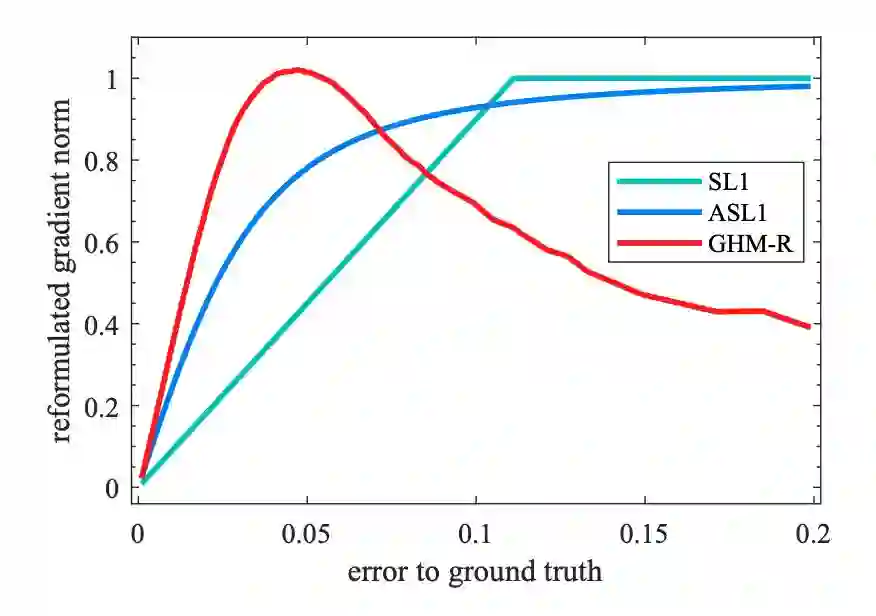 本文修改了损失函数,梯度密度中的梯度模长是基于修改后的损失函数 ASL1 的导数进行计算的,GHM-R 公式如下:
