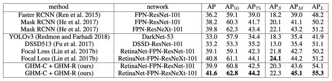 4. 无论是 Focal Loss,还是基于 GHM 的损失函数都可以嵌入到现有的目标检测框架中;Focal Loss 只针对分类损失,而 GHM 对分类损失和边框损失都可以