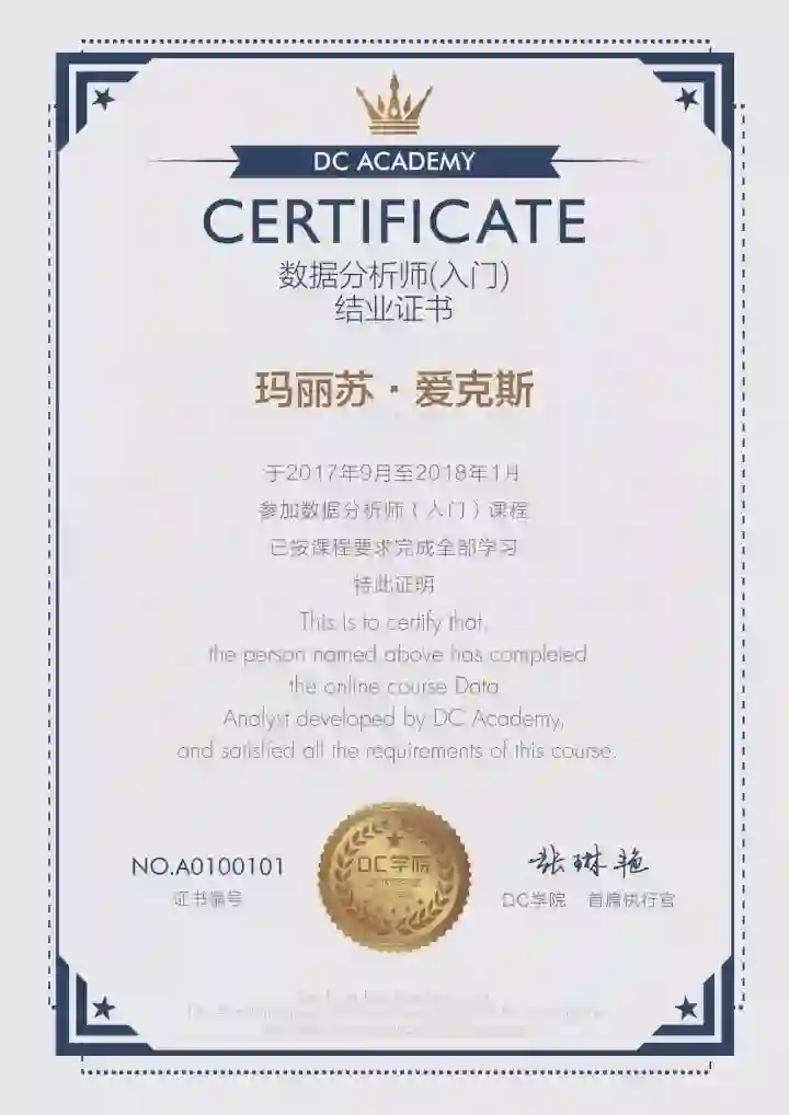学完课程并达到要求,发放数据分析师结业证书