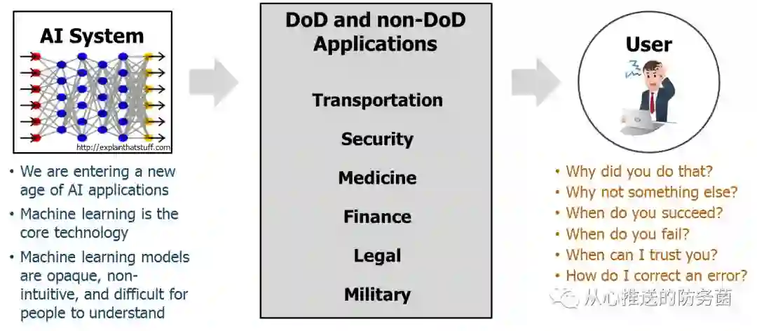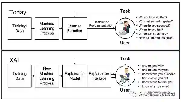 机器学习的巨大成功产生了大量人工智能(AI)应用项目。照此发展,其持续的进步有望产生能够自我感知、学习、决策和行动的自主系统。然而,这些系统的有效性受到机器当前无法向人类用户解释其决策和行动的限制(如下图)。美国国防部(DoD)面临着需要更智能、自主和共生系统的挑战。如果未来的战士能够理解,适当地信任并有效地管理新一代人工智能机器协作伙伴,那么可解释人工智能,特别是可解释的机器学习,将是必不可少的。