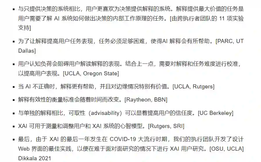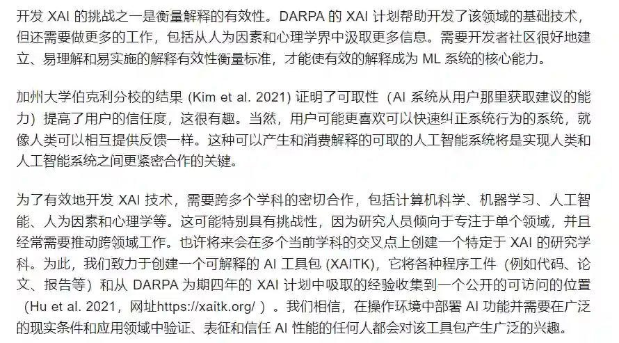 与 2015 年相比,今天我们对 AI 的理解更加细致入微、不那么戏剧化,或许也更加准确。我们当然对深度学习的可能性和局限性有了更准确的理解。人工智能的末日已经从迫在眉睫的危险变成了遥远的好奇。同样,XAI 计划对 XAI 产生了更细致入微、不那么戏剧化、或许更准确的理解。该计划无疑起到了促进 XAI 研究(包括计划内部和外部)的作用。结果对 XAI 的使用和用户、XAI 的心理、衡量解释有效性的挑战以及产生新的 XAI ML 和 HCI 技术组合有了更细致的理解。当然还有更多工作要做,特别是随着新的人工智能技术的开发,这些技术将继续需要解释。XAI 将在一段时间内继续作为一个活跃的研究领域。作者认为,XAI 计划通过为开展这项工作奠定了基础,做出了重大贡献。