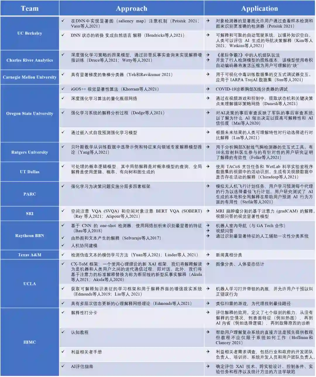 2017年5月,XAI计划开始启动。选择了 11 个研究团队来开发可解释学习器 (TA1),并选择了一个团队来开发可解释的心理模型。评估由美国海军研究实验室提供。以下总结了这些进展以及该计划结束时这项工作的最终状态。Gunning 和 Aha,2019 年给出了 2018 年底 XAI 发展的中期总结。