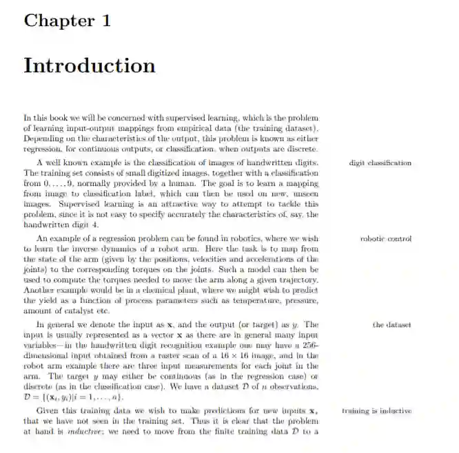 这本书处理监督学习问题的回归和分类,并包括详细的算法。提出了各种协方差(核)函数,并讨论了它们的性质。从贝叶斯和经典的角度讨论了模型选择。讨论了许多与其他著名技术的联系,包括支持向量机、神经网络、正则化网络、相关向量机等。讨论了包括学习曲线和PAC-Bayesian框架在内的理论问题,并讨论了几种用于大数据集学习的近似方法。这本书包含说明性的例子和练习,和代码和数据集在网上是可得到的。附录提供了数学背景和高斯马尔可夫过程的讨论。