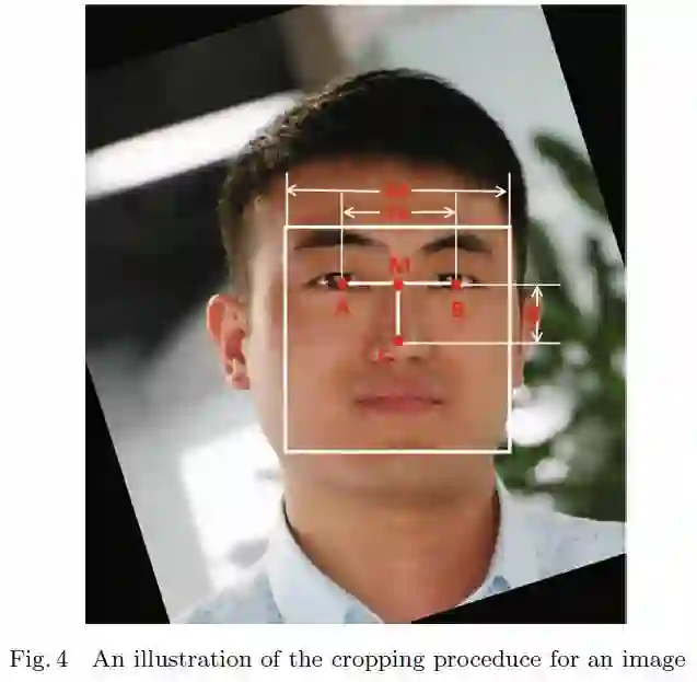 首先,基于本文作者前期研究的方法,将照片中的瞳孔设为面部特征点。而后,基于这两个特征点,再对数据集中的所有照片进行旋转或缩放调整,使其处在水平面的固定位置上。此外,为去除照片中的无关信息,本研究只选取了照片中的局部,保证眼睛处在同一水平面上, 并且露出一定量的脖子。