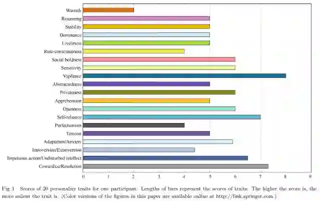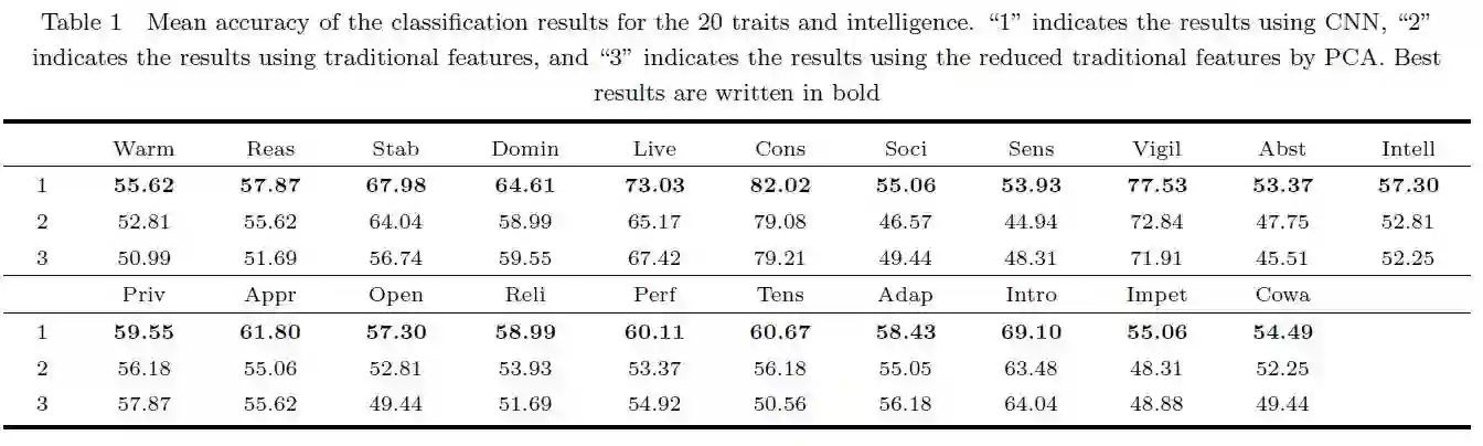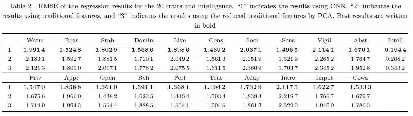 实验结果显示:“自律性”(rule-consciousness)、“乐群性”(openness)、“有恒性”(perfectionism)、“紧张性”(tension)的错误值较其他人格特征小,而“世故性”(social boldness)、“怀疑性”(vigilance)和“内外向性”(introverted or extroverted)则更大。这意味着后三种人格特征与面部特征关联较小。相比之下,智力的拟合误差(fitting error)高,因此很难通过面部图像准确预测一个人的智力水平。