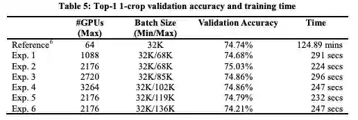 表1比较了近期一些工作的训练时间和top-1验证精度。其中,Facebook使用256个Tesla P100 GPU,在1小时内训练完ResNet-50,是加速了这一任务的著名研究。