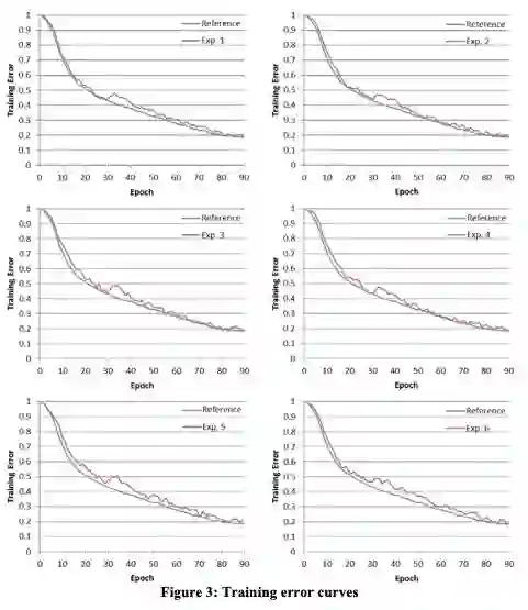 训练误差曲线与参考曲线非常相似(图3)。虽然最大的batch size可以增加到119K也不会造成明显的精度损失,但进一步增大会使精度降低约0.5%(表5中的实验6)。