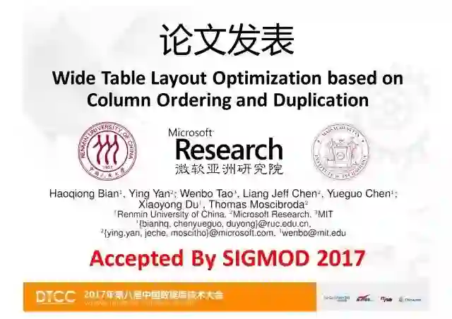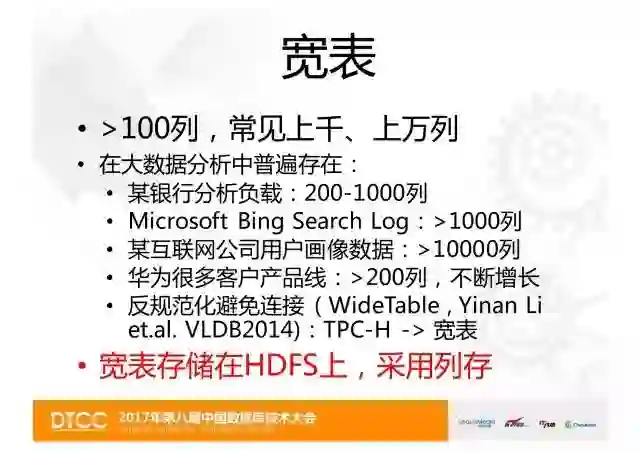目前在很多企业的数据分析任务中,常见几百上千列的宽表数据。这些宽表通常数据量巨大、存储在HDFS等分布式文件系统中。HDFS上宽表存储优化重要且具有挑战。宽表在数据分析中的可以避免一些频繁的连接操作,在用户画像、数据挖掘负载中,宽表也是一种高效的数据存取方式。对于宽表上的分析型负载,列存储可以有效减少不必要的I/O、提高数据压缩效果。HDFS上也已经有RC File、ORC、Parquet等成熟的列存储格式,但这些存储格式的设计只考虑了传统的数据分析负载,并没有针对宽表做深入的研究和优化。本工作介绍了HDFS上宽表列存储的特征和优化方法。该工作已在微软Bing日志分析产品中应用,并发表在SIGMOD 17上。