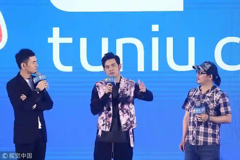2016年7月12日,周杰伦和方文山在途牛的发布会现场,©视觉中国