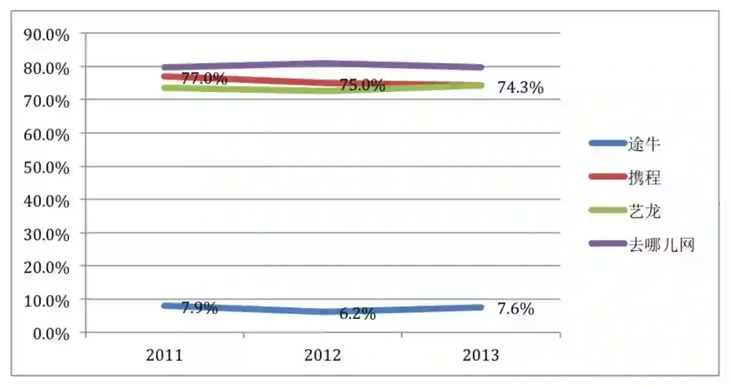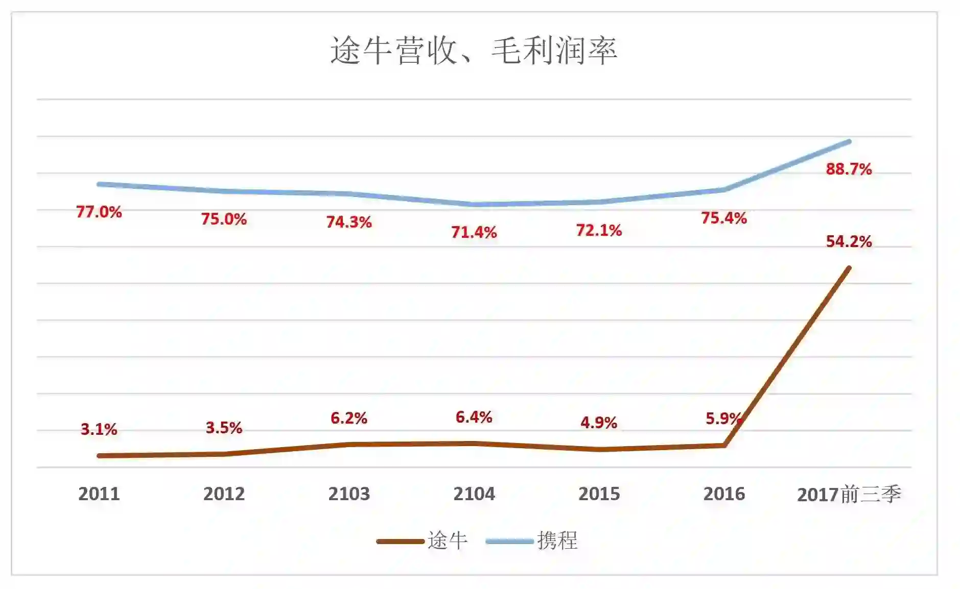 虎嗅2014年4月6日文指出途牛网“毛利润率低得惊人”,还给出一张对照图: