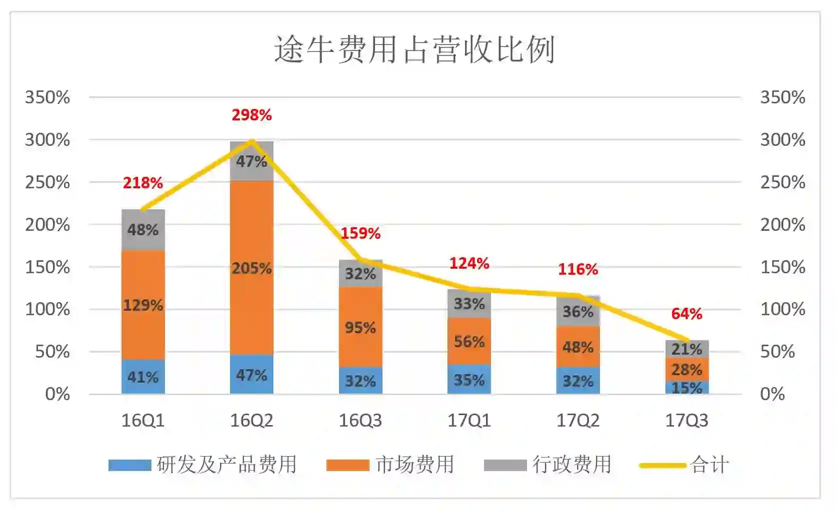 2017年Q3,途牛三项费用合计占营收的64%,2016年同期为159%,2016年Q2竟然达到298%。