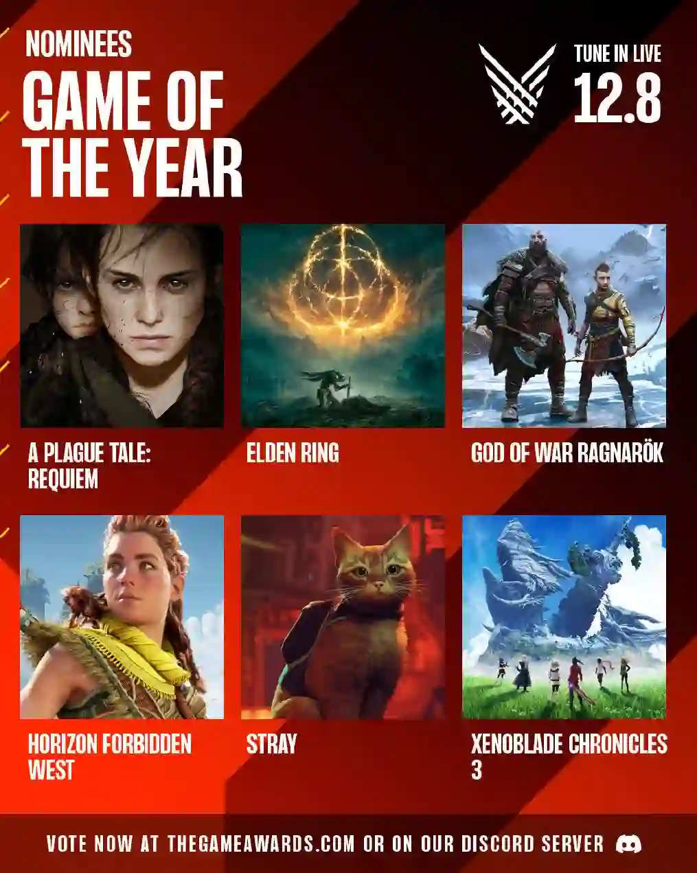 TGA 游戏大奖(The Game Award) 2022 年度的各个大奖提名现已公布。《艾尔登法环》、《异度神剑 3》、《瘟疫传说:安魂曲》、《战神:诸神黄昏》《地平线:西之绝境》、《迷失 Stray》获得了年度游戏提名,米哈游《原神》、完美世界《幻塔》、网易《暗黑破坏神:不朽》等获得最佳手机游戏提名,最终结果将于 12 月 8 日揭晓。