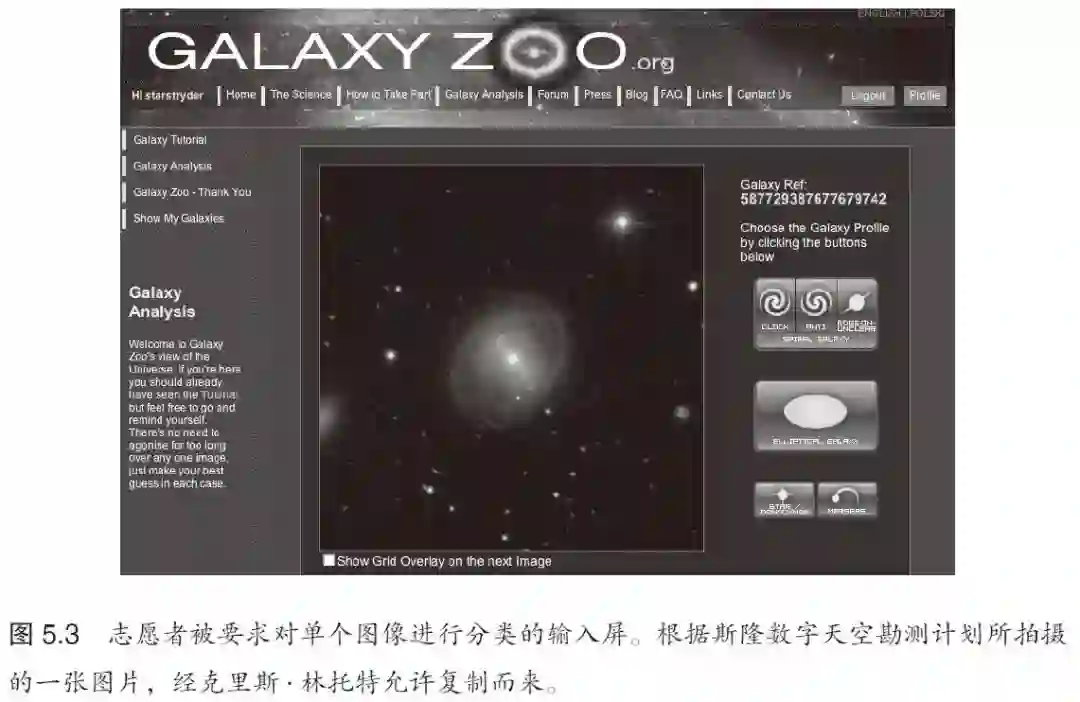 在星系动物园的网站上,志愿者需接受几分钟的训练。例如,了解螺旋星系和椭圆星系的区别。完成该训练后,每个志愿者必须通过一项相对简单的考试,即正确地将15个星系中的11个进行分类,然后就能开始通过一个简单的基于网络的界面对未知星系进行真正的分类了。从志愿者到天文学家的转变在不到10分钟内就完成了,而且只需跨越最低的门槛——一个简单的测试。