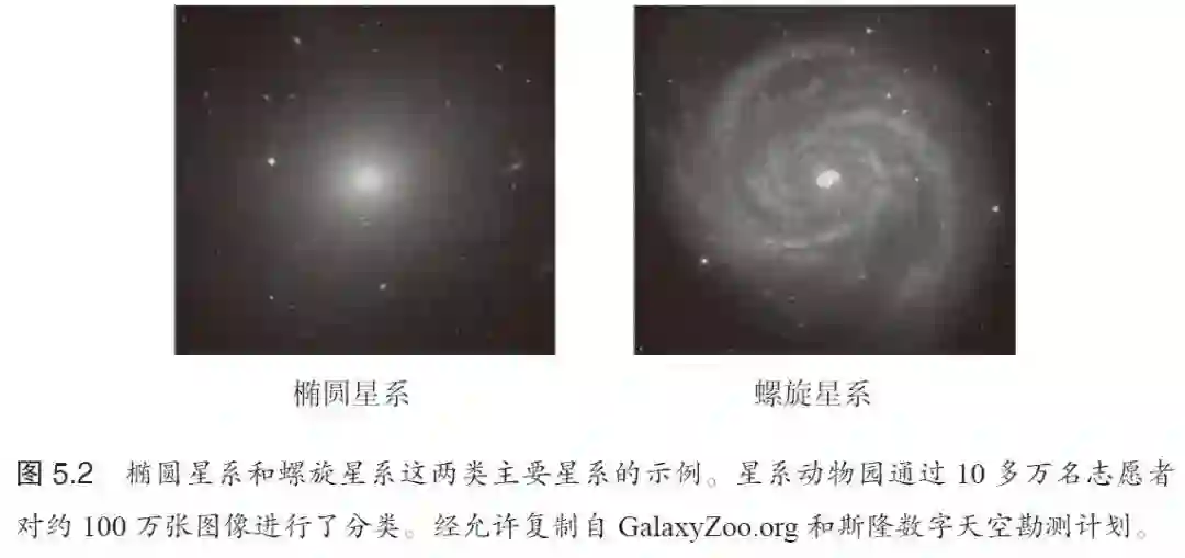 班纳吉和同事方法的核心实际上和社会研究中常用的技术非常相似,尽管乍一看这种相似性可能并不明显。首先,班纳吉和同事将每张图像转化成了一组概括其性质的数字特征。例如,星系图像可以有三个特征:图像中蓝色像素点数量、像素亮度方差、非白像素比例。选择正确的特征是这一问题的重要部分,这通常需要专业领域的专业知识。经过这一步,班纳吉和同事构建了一个数据矩阵,每一张图集都由一行和三列数据描述。根据该数据矩阵和期望输出值(例如,如采用人工分类,某一图像是否会被划分为椭圆星系),研究人员可以构建一个统计或机器学习模型。最后,研究人员可以利用该统计模型中的参数预测出新的星系的分类。在机器学习中,这种利用标签示例创建一个能标记新数据的模型的方法被称为监督式学习。