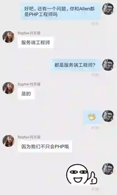 关于 Sophie,有个小故事可以跟大家分享。起初我看到她钉钉职位上写的是 PHP 工程师,就随口问了一句,然后: