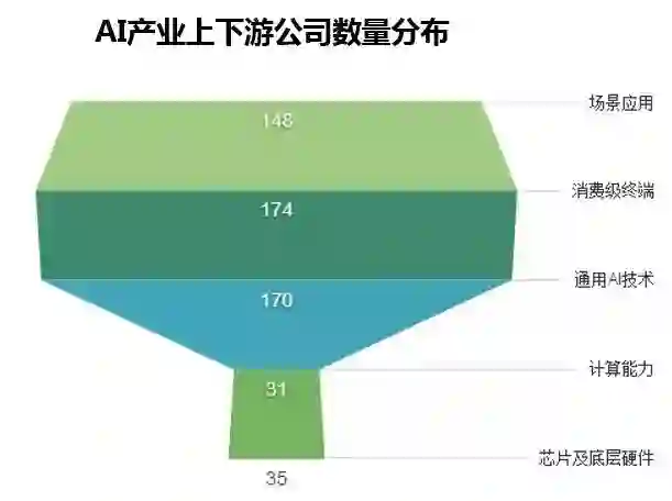 ...通过数据我们也看到了一个接近纺锤体的产业形态,大多数AI初创企业集中于通用AI技术以及成为了投资热点的消费级终端(智能机器人、无人机、智能硬件)上。行业场景应用方面虽然公司的绝对数量不少但过度集中于自动驾驶、智慧医疗和智慧金融上面,三者占了场景应用层65%的企业数量,融资金额更是占绝对多数。这反映了当前AI产业所面临的一个事实——在本轮AI创业浪潮之中,优秀资源(科学家、资金)集中在通用AI技术上。