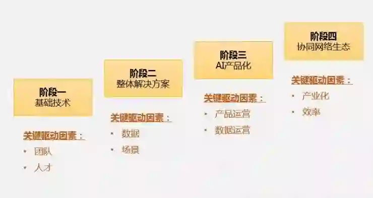 在AI应用场景尚未成熟和得到市场验证之际,任何AI企业都倾向于从事基础技术的积累,这点无论对于国内外AI初创企业而言都是一样的,最典型的案例是DeepMind。目前大多数国内AI初创公司均属于或者准备脱离这一阶段,基础技术积累阶段的特征是对于人才的争夺以及采取类似于实验室形式的AI技术与算法研发,而其核心驱动因素是团队与人才。在此阶段,AI企业们大多热衷于在各个顶级会议发paper以及参与到各项国际AI竞赛的刷榜之中,由于技术的商业化程度不足,往往只能通过项目制形式为客户提供AI技术服务,即简单粗暴地卖模型、卖算法,如人脸识别技术服务、基础语言识别服务、金融领域的知识图谱工程等。但以人和算法作为企业核心能力是不可持续的,尤其目前深度学习领域算法红利期变得越来越短,而人才缺口也在逐渐被填补。