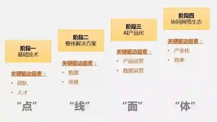 上文提出的AI企业成熟度模型,正是一家企业从技术情怀及崇拜出发、逐渐演变为伟大AI产品公司的路径,四个阶段实际上就是一个从“点”到“线”到“面”最终到“体”的演进过程。