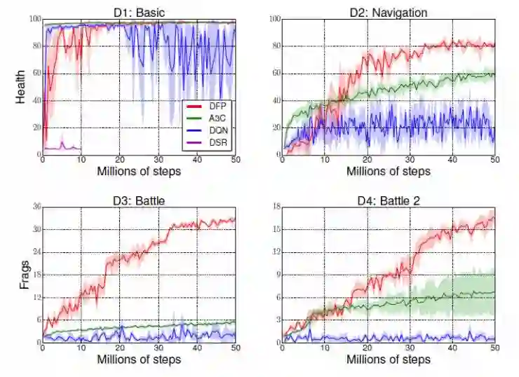图3:不同方法在训练中的表现。DQN,A3C和DFP在基础的场景中都取得了类似的表现结果。但是DFP在其它三个场景中取得的表现结果都超过了另外三个方法。并且在最复杂的两个场景下(D3与D4),DFP的表现结果远远优于另外三个方法。