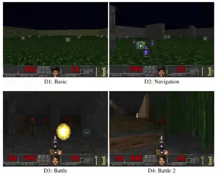 图2:展示了来自于四个场景的样例。D1展示了在一个正方形房间里收集医疗包(“Basic”)。D2展示了在迷宫中收集医疗包并且还要避开毒药(“Navigation”)。D3展示了在迷宫中收集医疗包和弹药并同时攻击敌人(“Battle”)。D4展示了在一个更加复杂的迷宫中收集医疗包和弹药并同时攻击敌人(“Battle 2”)。
