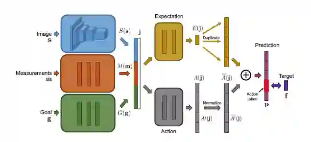 图1:网络结构。s表示图像数据,m表示测量,g表示目标。s,m,g首先通过三个输入模块分别进行处理。然后这些输入模块的输出结果将被连接成一个联合表示j。之后联合表示j被送入了两个并行的计算流进行单独处理,这两个计算流分别用于预测测量期望E(j)和归一化动作条件差异。最后两个计算流的输出将被组合到一起以获得针对每个动作的最终预测。