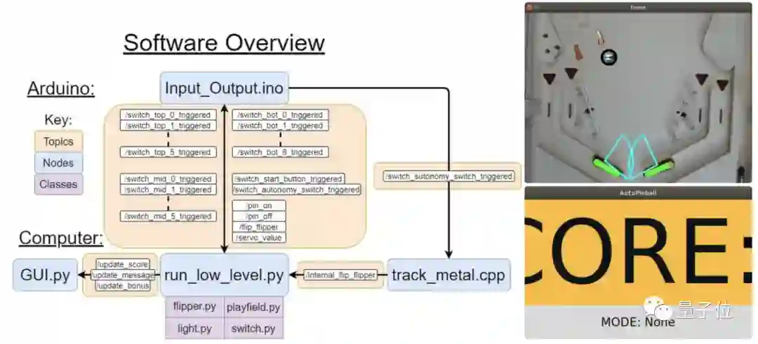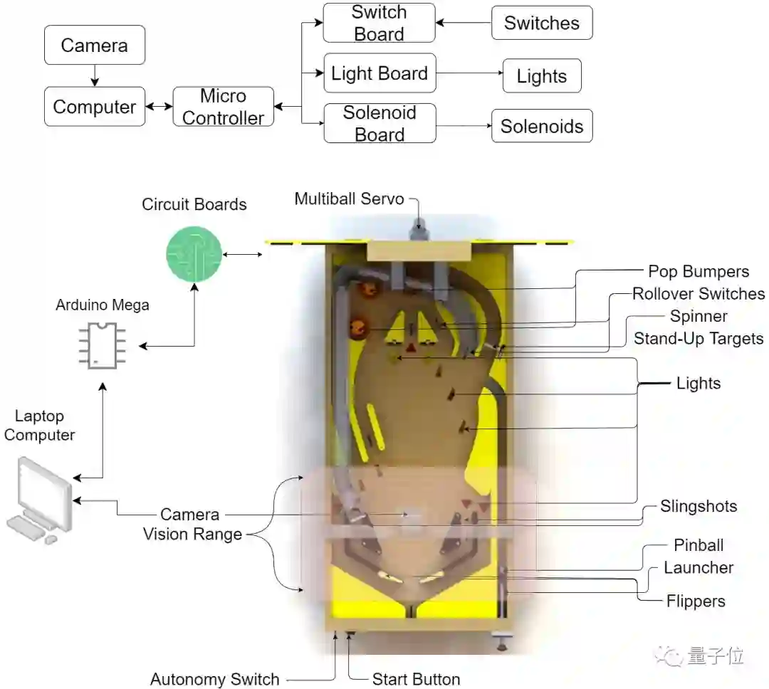 弹球机的主要功能模块包括追踪得分系统,多球弹珠机,还有自主启动开关。上方有一个USB摄像头,在自动运行模式下会持续地监测弹球的位置,并根据球的位置指挥击打器。