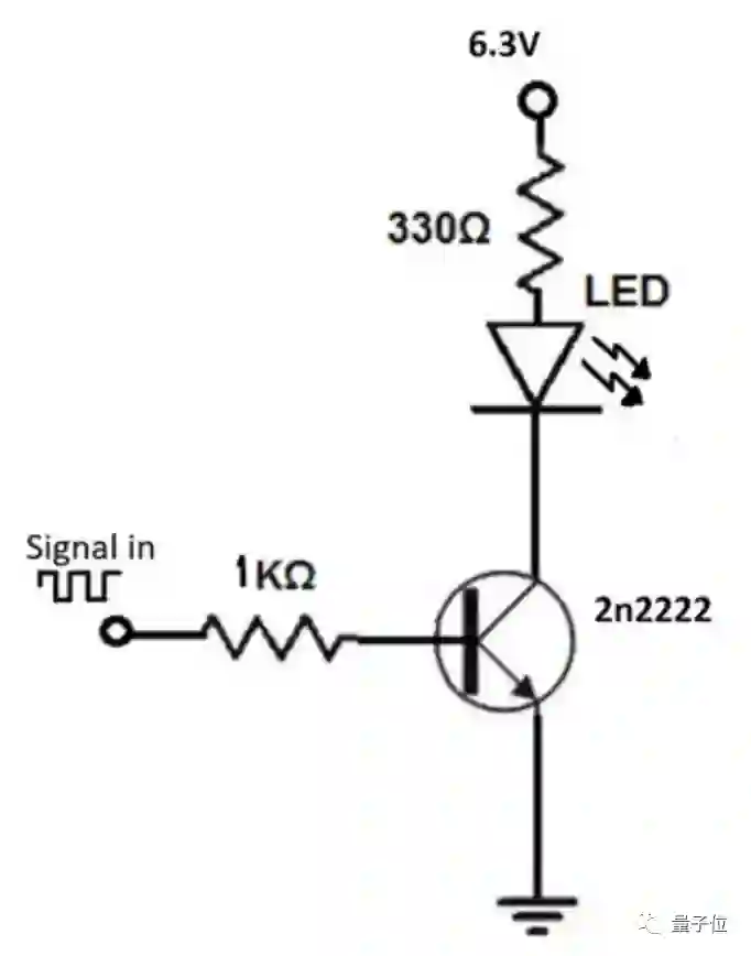 电路由一个BJT晶体管(2n222222)、几个电阻和LED组成。