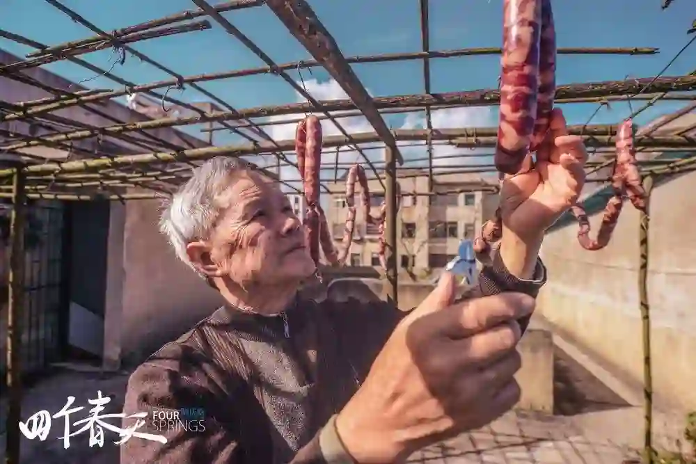 纪录片《四个春天》中父亲晾晒腊肠的场景
