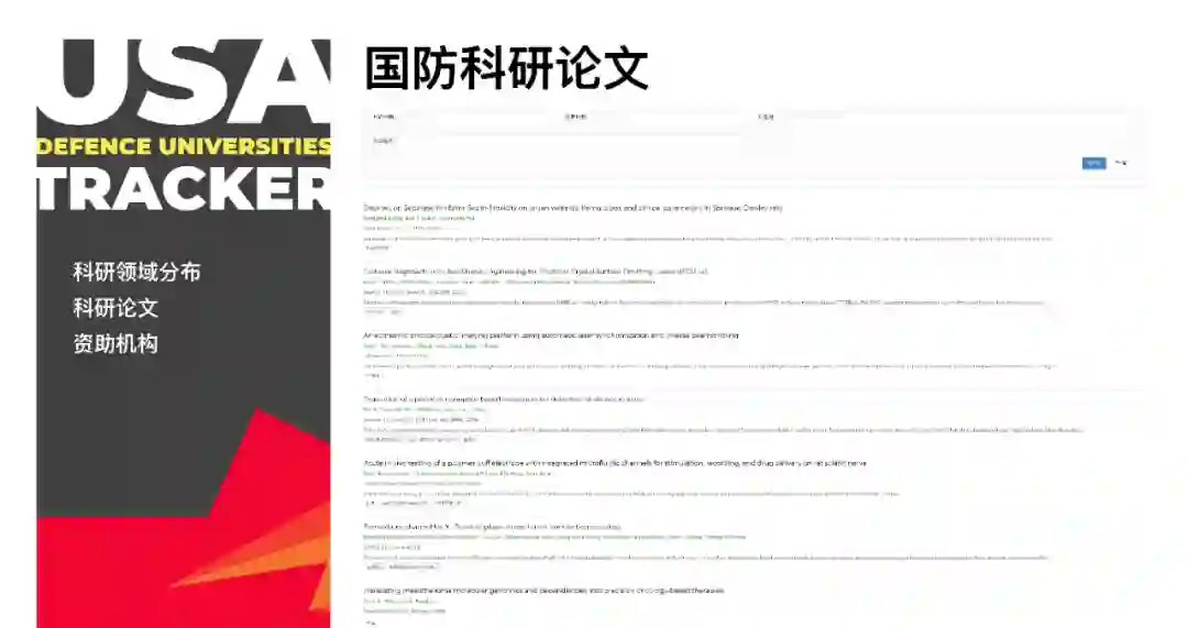1. 国防研究领域:对美国国防科研涉及的所有领域分析,可以直接看到参与该领域研究的大学,以及该大学为单位在该领域所发表的论文。