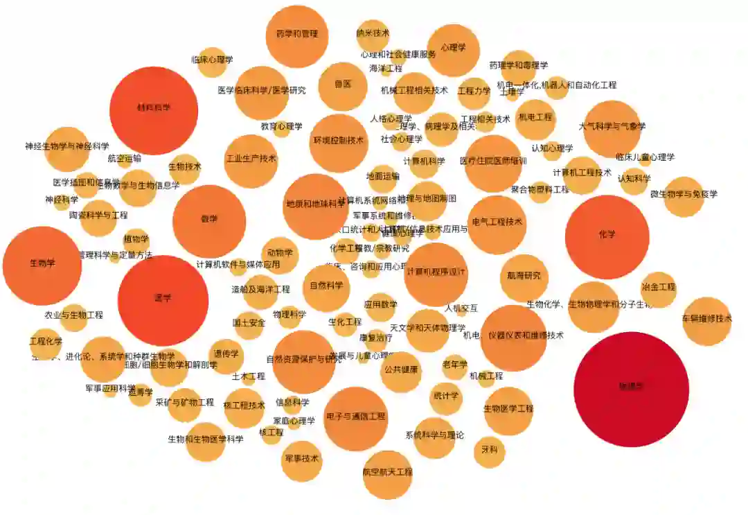 通过美国国防科研情报分析系统提供的数据,我们了解到美国的国防研究领域众多,包括材料、化学、光学、太空科学、医学、计算机、纳米技术、生物等我们常见的领域,同时也包含土壤学、生态学、海洋学、气候学、心理学等看起来和军事“关系不大”的领域,可以说几乎所有学科在美国国防研究都有涉及,而这背后每个领域都有美国高校的身影,美国高校参与之广、之深超乎所料。