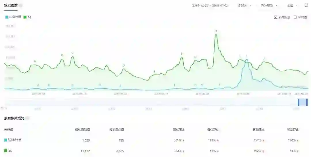 伴随中美谈判进程,A股资本市场风云变幻,5G拉动一波主力行情,这波行情快速席卷柔性屏、物联网、智慧城市等概念。边缘计算也毫不例外,在公募基金市场边缘计算概念基金上季度(2019Q1)平均涨幅35.14%,排入Top 10最火概念板块且后劲十足。无独有偶,作为流量聚集地的“百度搜索指数”显示(图1),近90天边缘计算搜索指数移动端同比增长457%,环比增长178%,其搜索绝对值更是在3月初达到峰值,甚至超过5G。