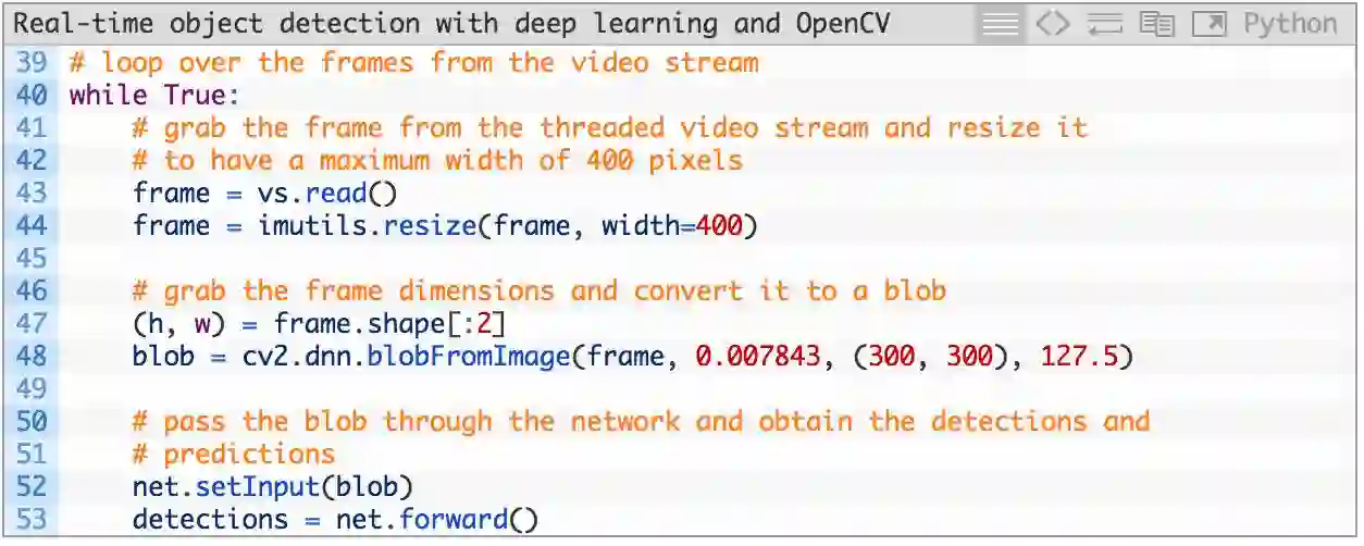 首先,我们从视频流中读取一帧(第 43 行),随后调整它的大小(第 44 行)。由于我们随后会需要宽度和高度,所以我们在第 47 行上进行抓取。随后将 frame 转换为一个有 dnn 模块的 blob(第 48 行)。