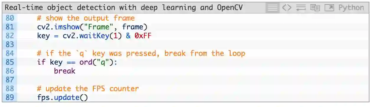 上述代码块简单明了,首先我们展示帧(第 81 行),然后找到特定按键(第 82 行),同时检查「q」键(代表「quit」)是否按下。如果已经按下,则我们退出帧捕捉循环(第 85、86 行)。最后更新 fps 计数器(第 89 行)。