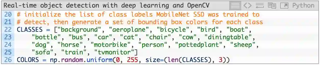 在第 22-26 行,我们初始化 CLASS 标签,和相应的随机 COLORS。有关这些类的详细信息(以及网络的训练方式),请参考:http://www.pyimagesearch.com/2017/09/11/object-detection-with-deep-learning-and-opencv/