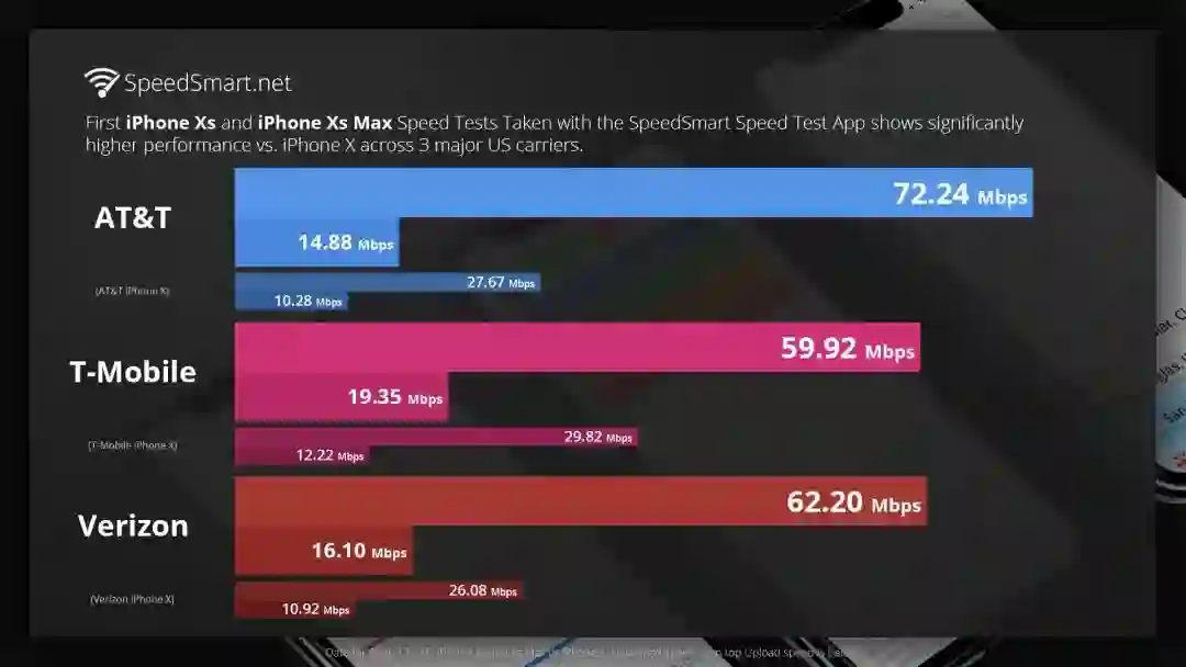 这次的测试采用了 SpeedSmart Speed Test 应用,测试时间是 9 月 12 日 ~ 16 日期间。尽管初期测试样本数量有限,但结果已经很清楚了。需要注意的是即将推出的 iPhone XR 上我们不会看到这项改进。
