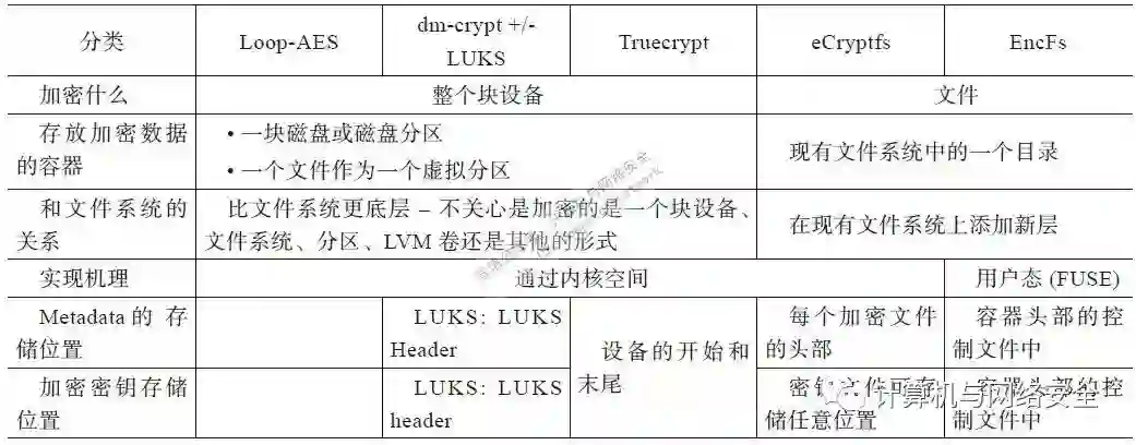 磁盘文件加密主要是针对非结构化数据,例如备份文件等。应用本身不需要关注加密过程,只需要将文件扔到加密存储介质上,高性能的磁盘加密一般都通过硬件加密芯片实现。它的通病是一旦密钥泄露就会失效,表1是对几种主流加密方式的对比。