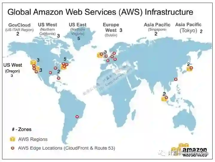 在云的虚拟化环境中,一般情况用VPC隔离。但对于GovCloud这种保密要求极高的系统也采用了物理隔离。物理隔离虽然有点跟云计算一切资源皆可共享的理念有点不搭调,但在安全上却是真实的需求。AWS全球节点如图4所示。