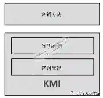 如图8所示,密钥管理基础设施(KMI)通常分两部分:密钥的存储,对密钥本身的访问授权管理。更上层的加密方法通常由应用自身去实现。