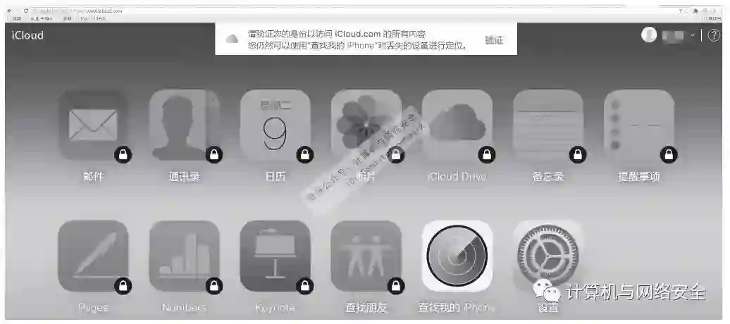 首先账户要启用2FA,当启用2FA后,即使攻击者取得了账户的口令直接登录iCloud,也会看到如下界面,邮件、通讯录、照片等均显示为上锁不可访问的状态,如图10所示。