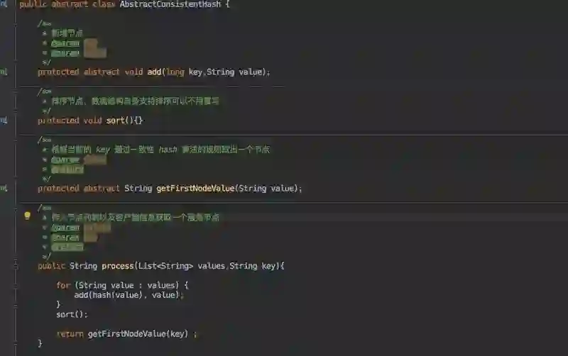 在应用的时候考虑到就算是一致性 hash 算法都有多种实现,为了方便其使用者扩展自己的一致性 hash 算法因此我定义了一个抽象类;其中定义了一些模板方法,这样大家只需要在子类中进行不同的实现即可完成自己的算法。